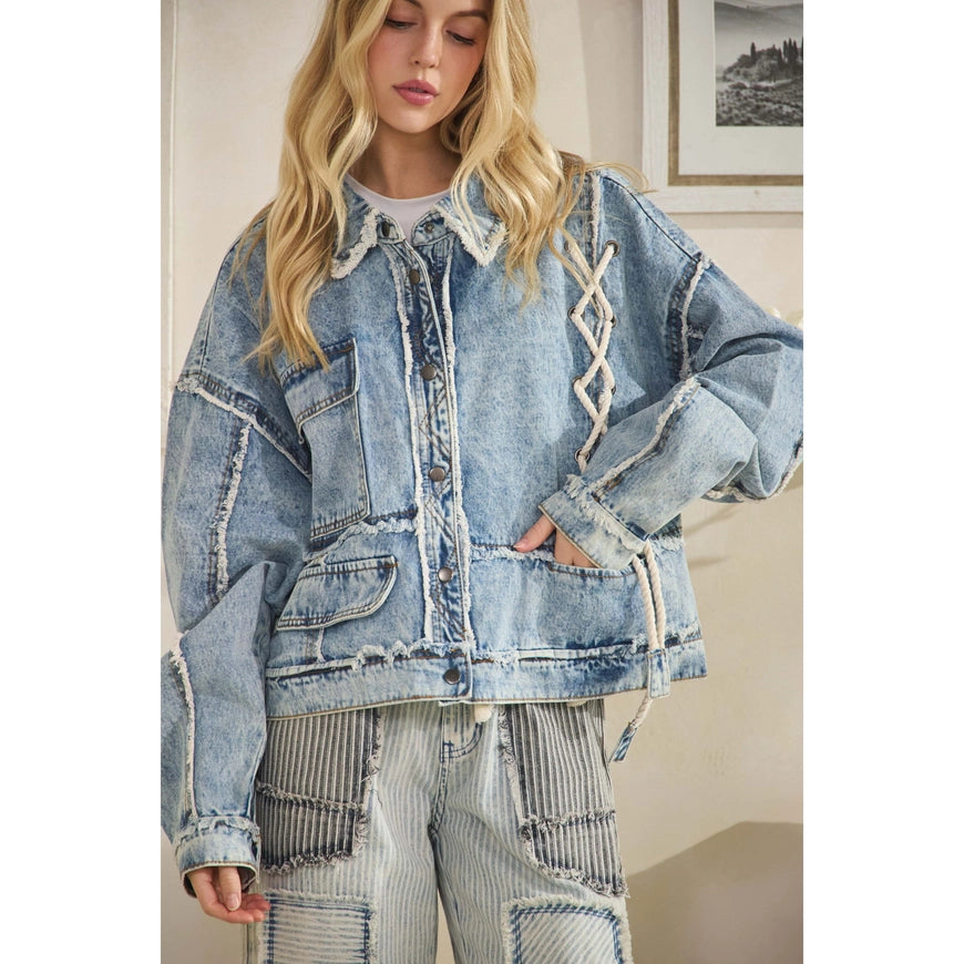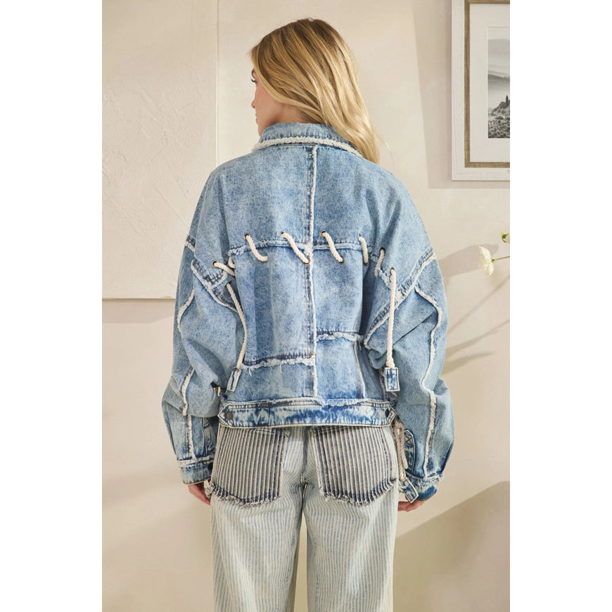 Elevate your denim game with this statement-making jacket. Crafted from a soft 93% cotton, 7% polyester blend, this piece brings together rugged texture and unique detailing for a look that stands out effortlessly. Featuring bold rope lace-up accents, raw-edged seams, and oversized utility pockets, it delivers the perfect mix of edgy and chic.